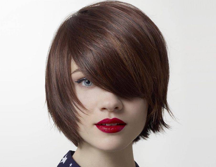 Длинные пряди челки и короткие боковые локоны подчеркивают линию скул, именно поэтому стилисты рекомендуют этот вариант девушкам с миниатюрными чертами лица.