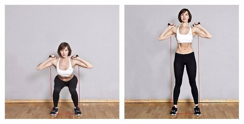 Приседания. Наступите на ленту и поставьте стопы на ширину плеч. Возьмитесь за концы эспандера, заведите стропу за локти, и поднимите руки к плечам. Можно завязать ленту и положить ее на плечи, тогда потребуется лишь придерживать ее. Из этого положения делайте приседания.