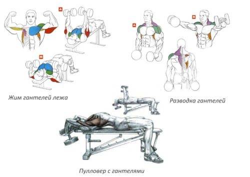 - Жим лежа с гантелями (горизонтальный или наклонный);