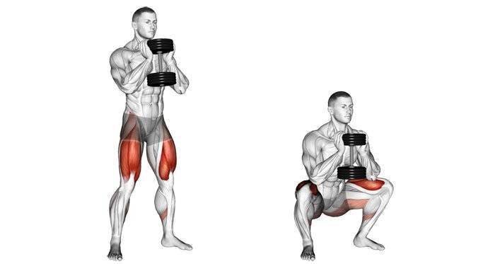 Кубковые приседания напрягают квадрицепсы, задние мышцы бедра и ягодичные мышцы. Для выполнения этого упражнения требуется всего одна гантель.