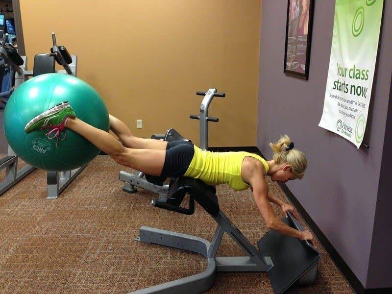 Еще один альтернативный вариант — гиперэкстензия на фитболе. Мяч должен находиться в области таза, носки — упираться в пол. Будьте аккуратны, и старайтесь сохранить баланс.