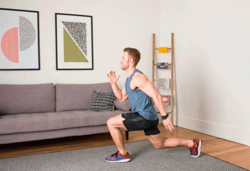 Технически – это выпад с фиксацией «задней» ноги на диване или другой опоре. Опускаться надо прямо, так, чтобы колено передней ноги не было «острым», а угол между голенью и полом оставался прямым.