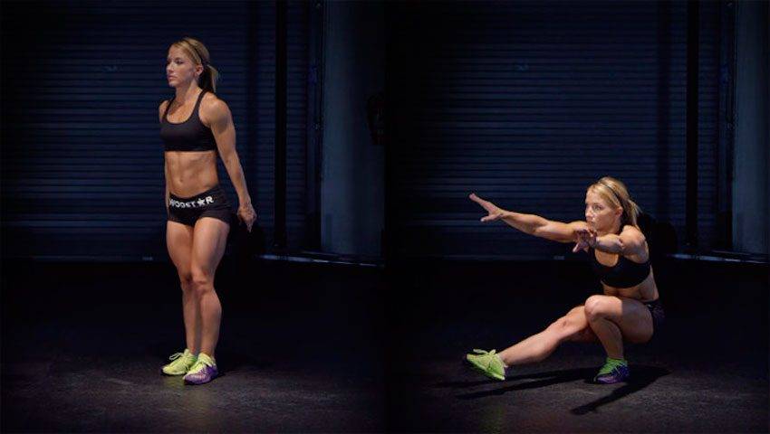 Встать прямо, руки скрестить перед грудью, стараться держать спину вертикально, и не тянуться ягодицами назад. Со вдохом опуститься вниз, разводя колени в стороны, таз – ниже колен. С выдохом – встать прямо. Не наклоняться вперед, не менять положение спины, и не менять положение коленей- не сводить их внутрь.