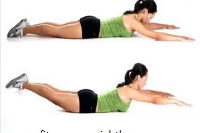 Упражнение выполняется в положении лежа на животе. Для него можно применять спортивный шар. В руки возьмите небольшие гантели, напрягите спину, немного приподнимите грудную клетку. Поднимите руки вверх, затем разведите их в стороны, а после потяните вперед, касаясь головы.