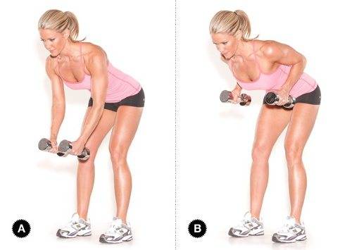 Для выполнения их вам нужна будет скамья, стол или любая другая поверхность. Поставьте одно колено на подставку, в противоположную руку возьмите гантель небольшого веса. Теперь немного отклонитесь назад и поднимите снаряд, поднимая и сгибая руку. Вы должны ощутить напряжение в спине. Повторите не менее 12 раз, затем смените руку.