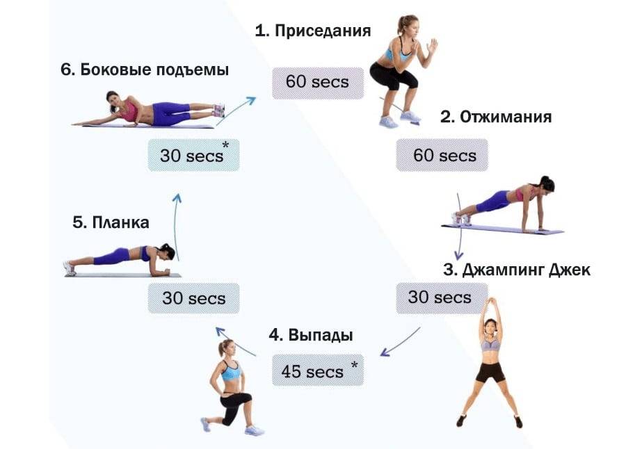 Важно! Не отдыхать после каждого упражнения, а делать их непрерывно. В этом и заключается смысл кругового метода