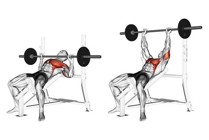 - Наклонный вариант предполагает усеченную амплитуду. Не рекомендуется касаться грифом груди. Иначе возникает риск получения травмы, поскольку суставы плеч резко напрягаются, что делает совершение мощного толчка штангой вверх затруднительным. Касание допустимо в тех случаях, когда делают специализированные жимы на развитие мобильности плечевого сустава, когда задействуют минимальные веса.