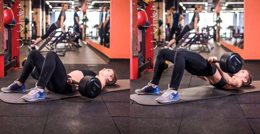 - Подъем со штангой лежа на полу. Этот вариант несколько больше нагружает спину, но он более стабильный и безопасный для тех, у кого есть проблемы с поясницей. Штанга накатывается на бедра аналогично предыдущей версии упражнения, но атлет выполняет подъем с выходом на лопатки и обратное опускание, и бедра при этом принимают угол 30 градусов к полу;