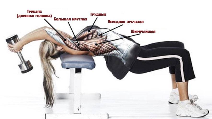 Поскольку в данном положении тазовая часть находится на уровне ниже плечевого пояса, ключевая нагрузка ложится на широчайшие мышцы. Слегка согнув локти и сделав вдох, плавно отвести гантель за голову как можно ниже. Достигнув точки, при которой появляется ощущение максимального растяжения мышц, также не спеша поднять гантель и делая выдох, довести ее до стартовой позиции над грудной клеткой. Во время выполнения упражнения, следить за тем, чтобы бедра пребывали в неподвижном положении – не поднимаясь и не опускаясь вместе с опусканием гантели.