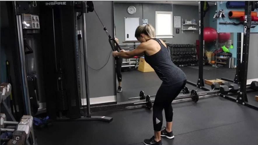 - На выдохе тянем прямыми руками трос вниз к бедрам. Одновременно с этим начинаем сводить лопатки.