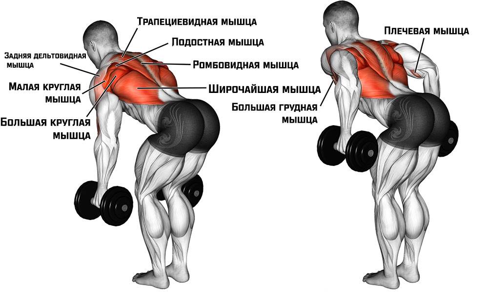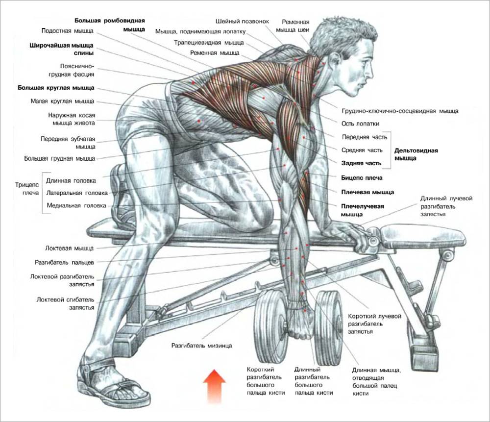 Наклоняя корпус вниз под углом 90 градусов, вы нагружаете нижнюю часть широчайших. Работать должны именно мышцы спины, но трапециевидные мышцы, руки и плечи (задние дельты, трицепс, бицепс) тоже окажутся задействованы. Если скамья наклонена и туловище находится под углом 30-45 градусов, то уменьшается нагрузка на поясницу, прорабатывается верхняя область широчайших.