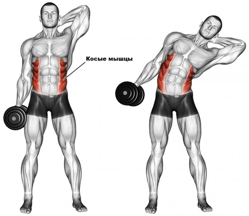 - Идеальная амплитуда этого упражнения – гантель опускается до уровня коленного сустава и ниже, это движение должно максимально нагружать косые, а не создавать нагрузку на трапецию за счет подъема плеча. Работа по слишком короткой амплитуде не позволяет растянуть косые мышцы;