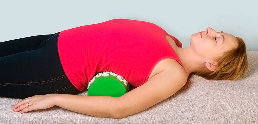 Соблюдать последовательность действий: занять положение «сидя», нижние конечности должны быть прямыми, положить валик под спину в области пупка (это важно). Плавно лечь на валик, проверить правильность расположения его под поясницей (провести условную линию вниз от пупка, если палец коснулся середины валика – он расположен верно).
