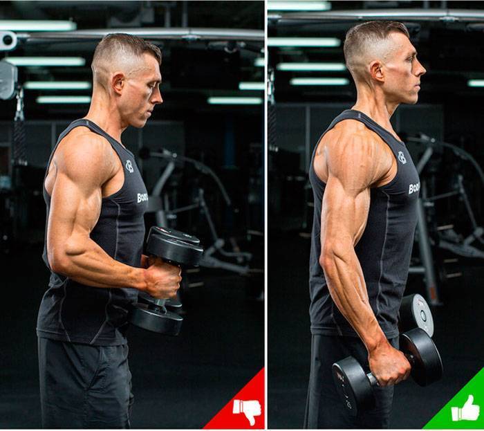 • Не нужно выбирать слишком тяжелые гантели. Большой вес позволяет получить существенную гипертрофию, но если спортсмен не может удержать грифы в одной плоскости, «тянет» гантели вверх за одну сторону, и активно переразгибает при этом локти, он провоцирует травму. Небольшая «тряска» мышц и нестабильность допускаются на последних повторениях.