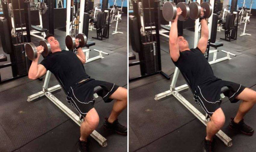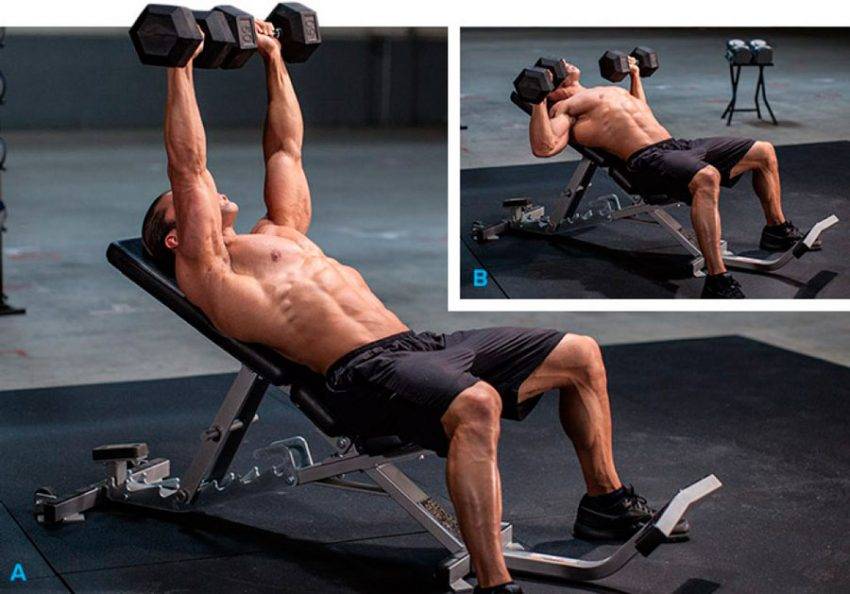 Жим гантелей на наклонной скамье: техника головой вверх, под углом 30 и 45 градусов