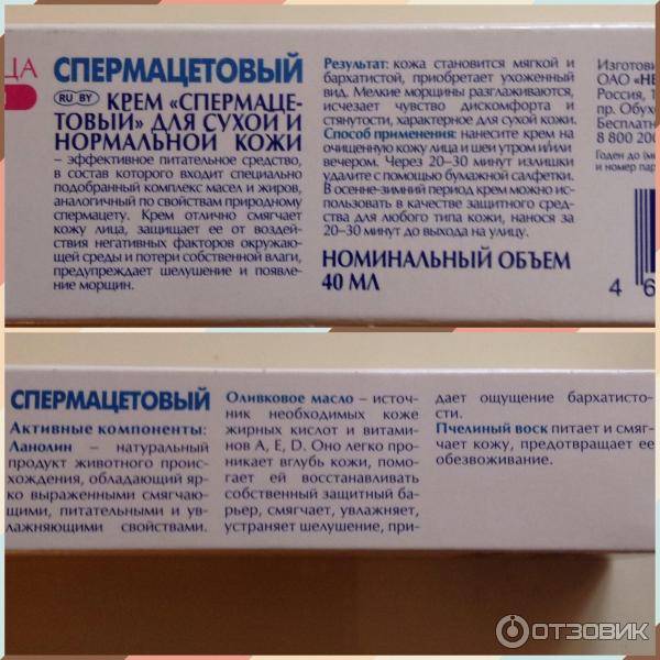 Благодаря такому составу спермацетовый крем должен устранять сухость, смягчает лицо, защищает от потери влаги, предупреждает появление морщин и шелушение.