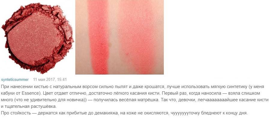 - Поскольку средство достаточно сильно пигментировано, необходимо набирать на кисть небольшое его количество, краситься при хорошем освещении и тщательно растушевывать. Такой способ нанесения позволит вам не перегрузить ваш макияж излишними красками.