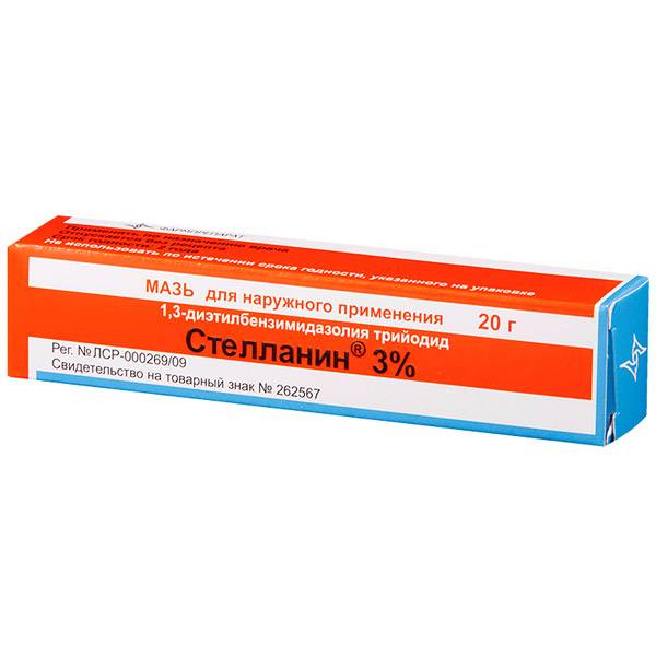 Лекарство «Стелланин» (мазь) содержит в составе 1,3-диэтилбензимидазолия трийодид. Данное действующее вещество обладает регенерационными способностями при соприкосновении с раной на коже.