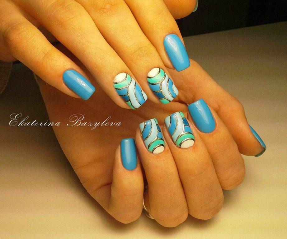 Голубой хорошо дополняется разными оттенками, этот цвет охотно идёт на компромиссы. Спокойный лазурный тон в сочетании с пастельной гаммой делает маникюр более нежным, а при нанесении ярких цветов получаются привлекательные дизайны, поднимающие настроение. Модные тенденции приветствуют использование как традиционных сочетаний, так и смелые эксперименты.