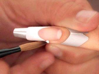 После этого необходимо снять липкий слой гелевого средства. На слой формы, который остался свободным, накладывается базовый гель, и с помощью белого геля наносится френч. Ногти высушиваются по несколько минут.