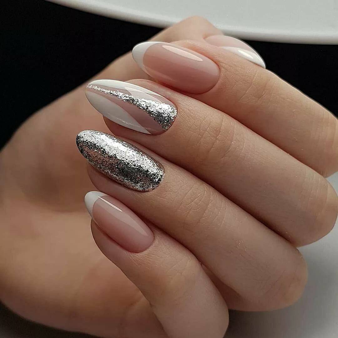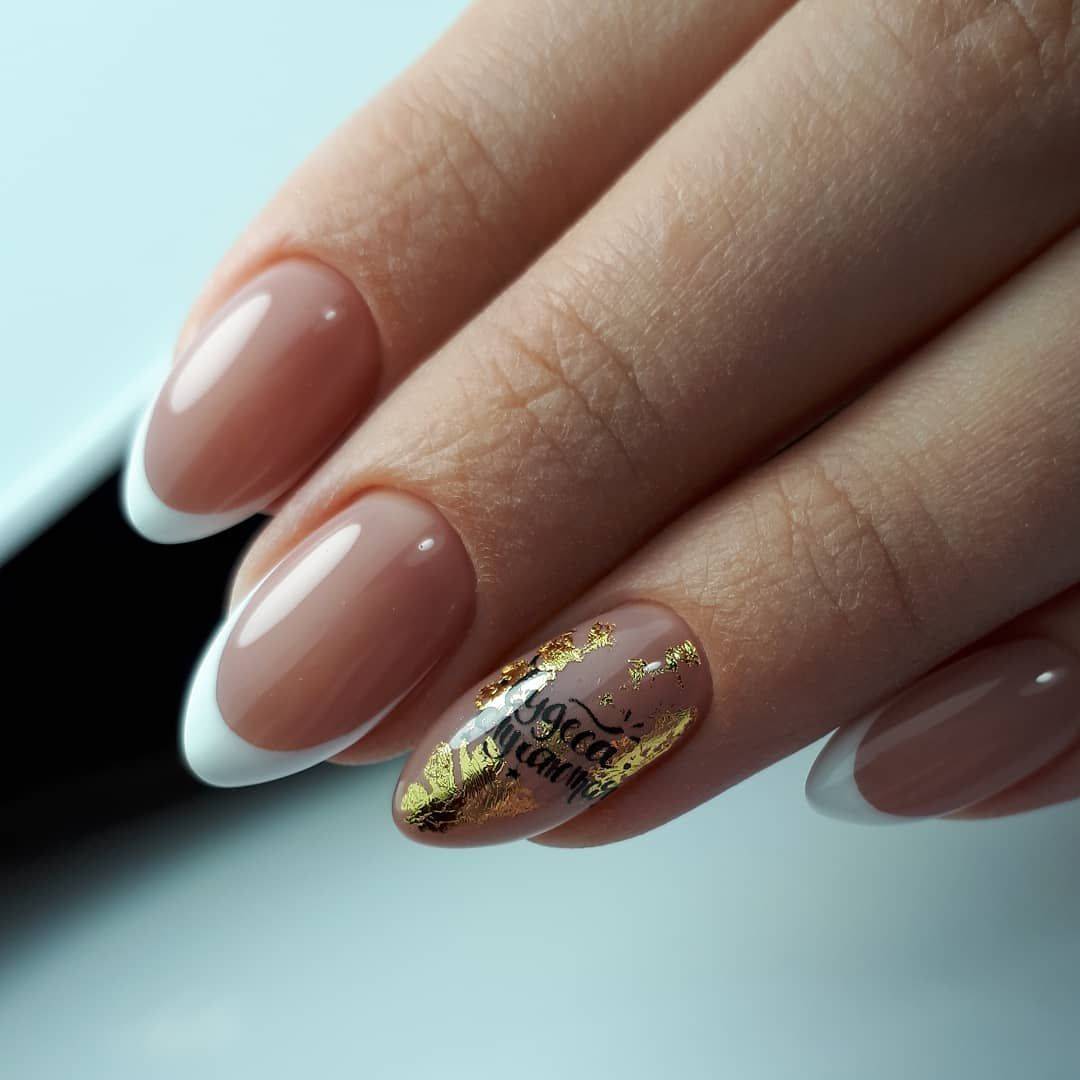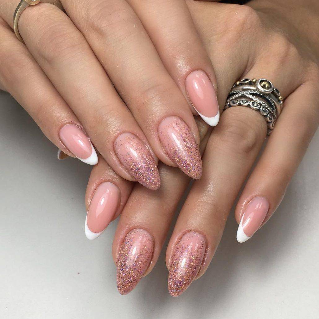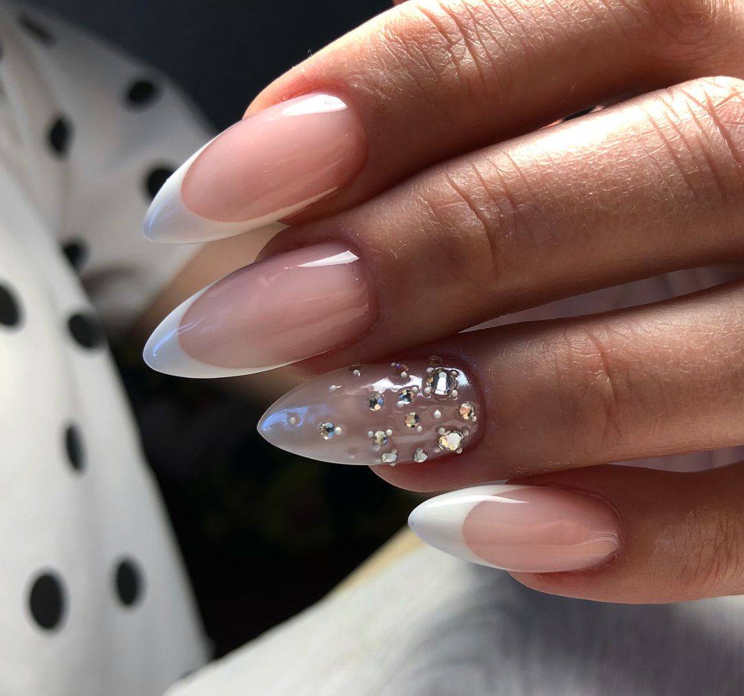 Миндалевидные ногти — это ногти со смягченными углами и плавно зауженным кончиком. Такая форма не выходит из моды последние два года. Если у вас ногти именно такой формы, попробуйте френч, как на картинке ниже.