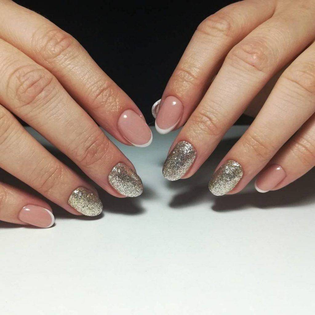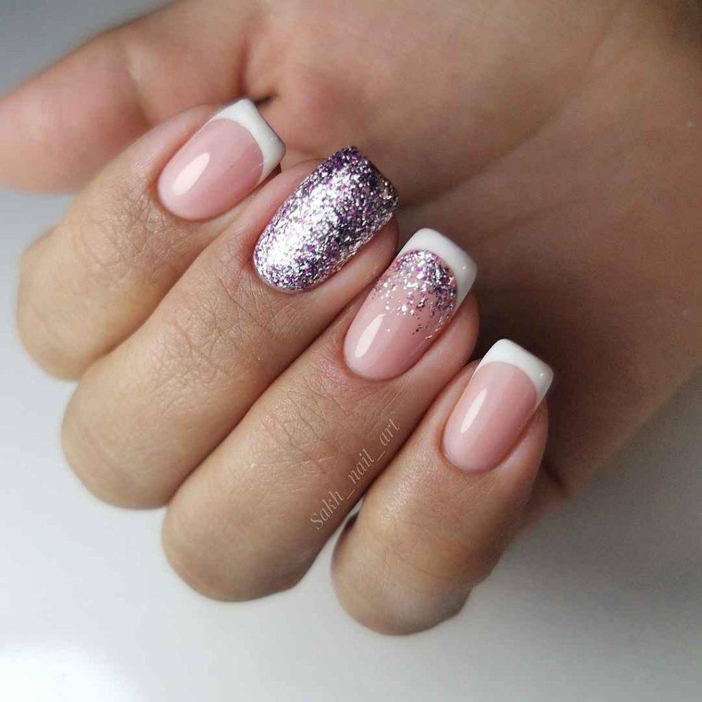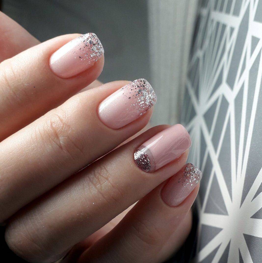 Блестки лучше всего вписываются в плавные линии френча, акцентируют внимание на ноготках, окрашенных в пастельные, едва заметные оттенки