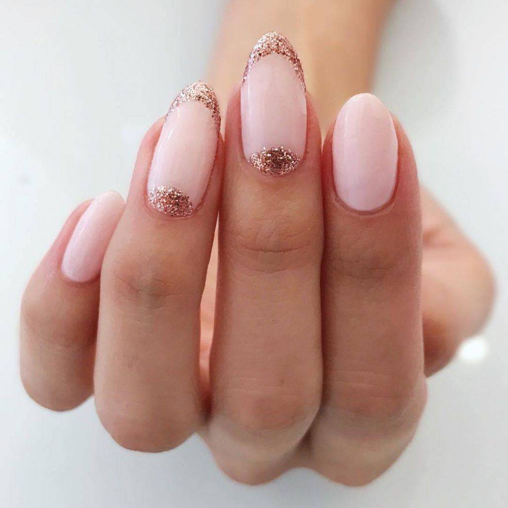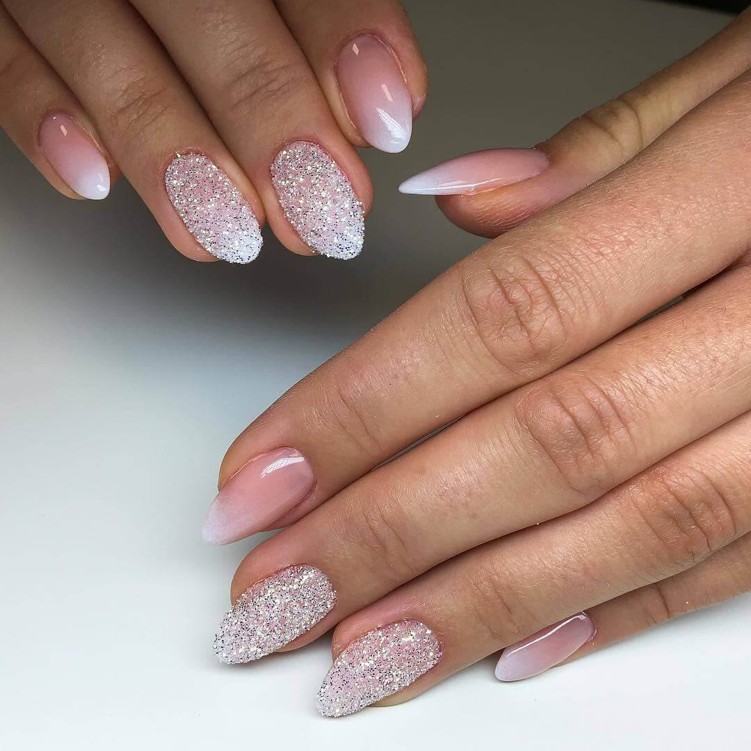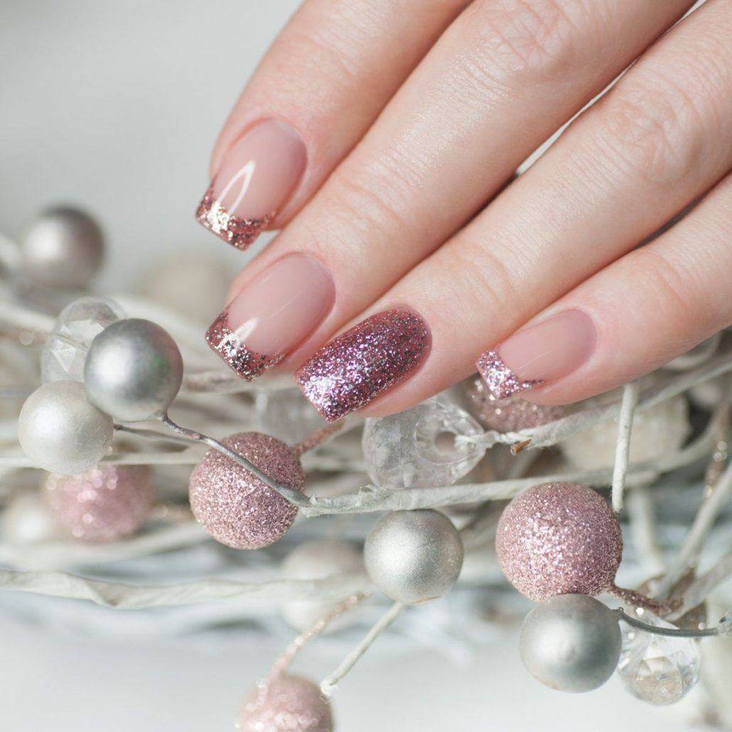Блестки лучше всего вписываются в плавные линии френча, акцентируют внимание на ноготках, окрашенных в пастельные, едва заметные оттенки