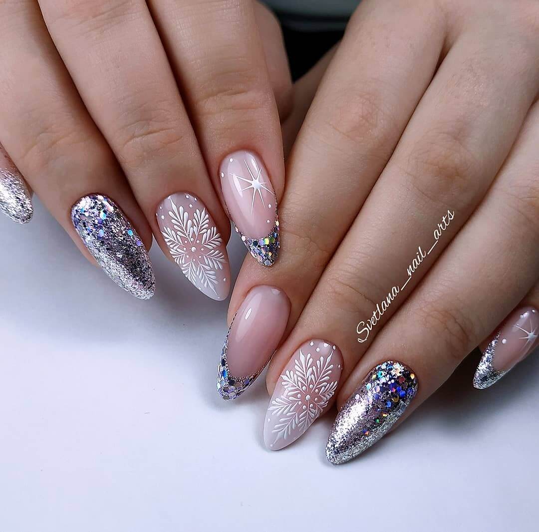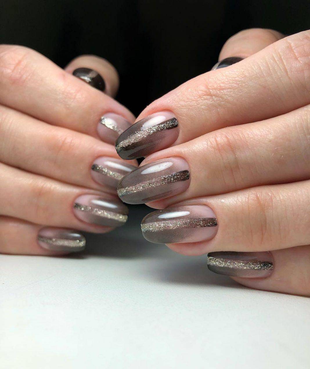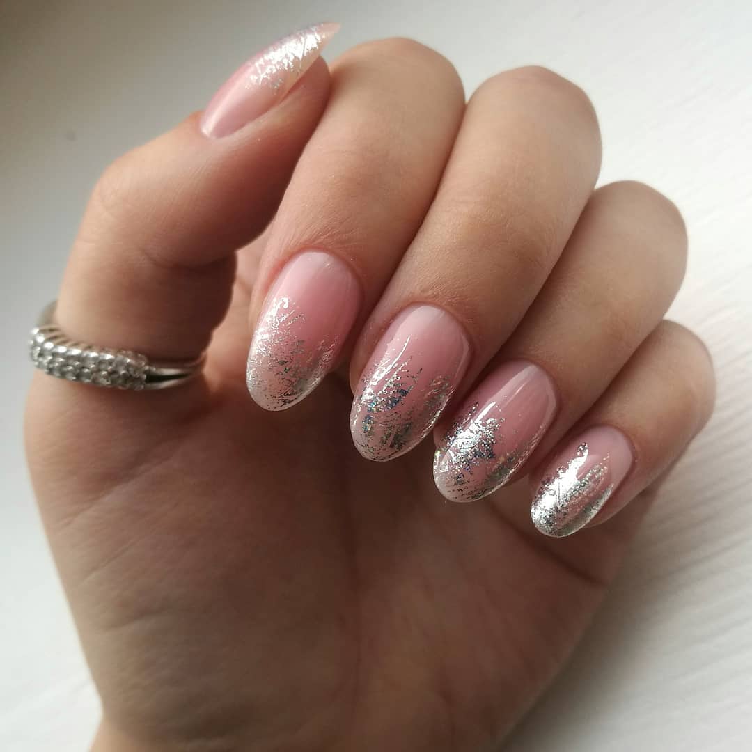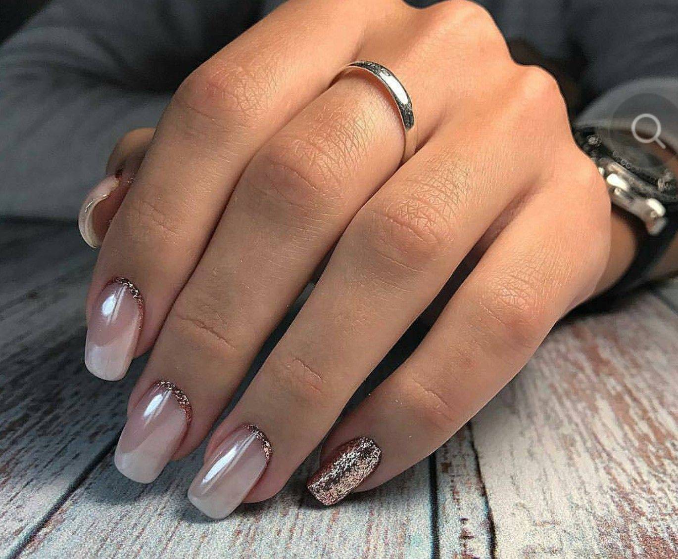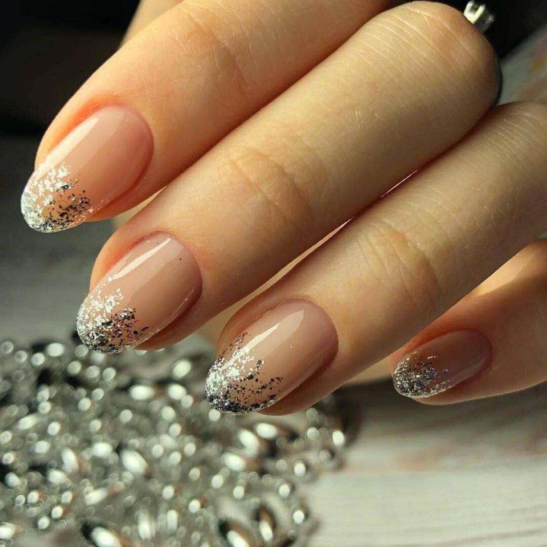 Эти оттенки великолепно гармонируют с серебряным глиттером, с жемчужной втиркой, с пайетками в форме сердечек или звездочек. Выполните классический френч с овальной или треугольной улыбкой и украсьте прикорневую зону блестящим декором. Что касается втирки, то под этот материал обычно отводится один из ноготков. Втирка отлично показывает себя именно на большом пространстве ногтевой пластины.