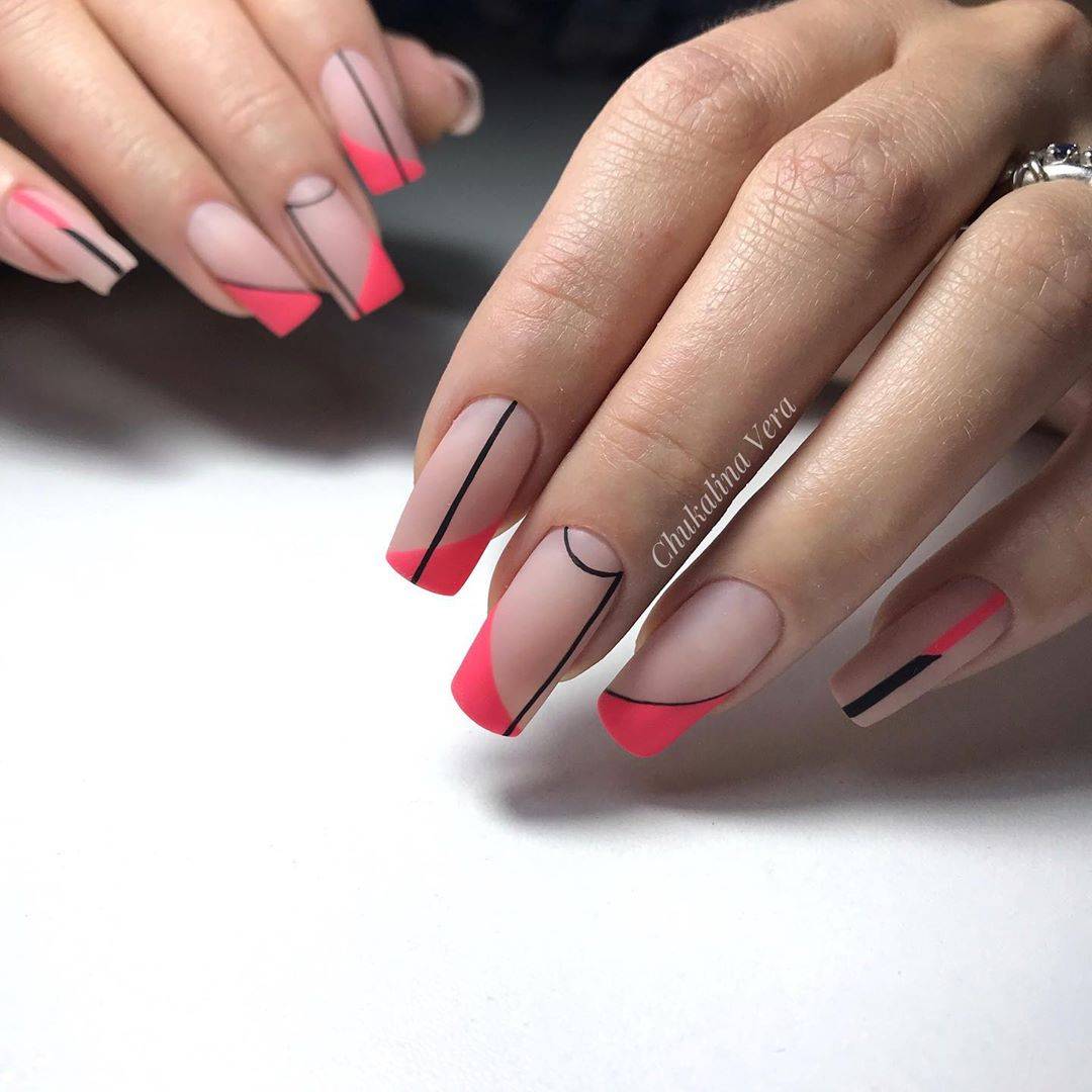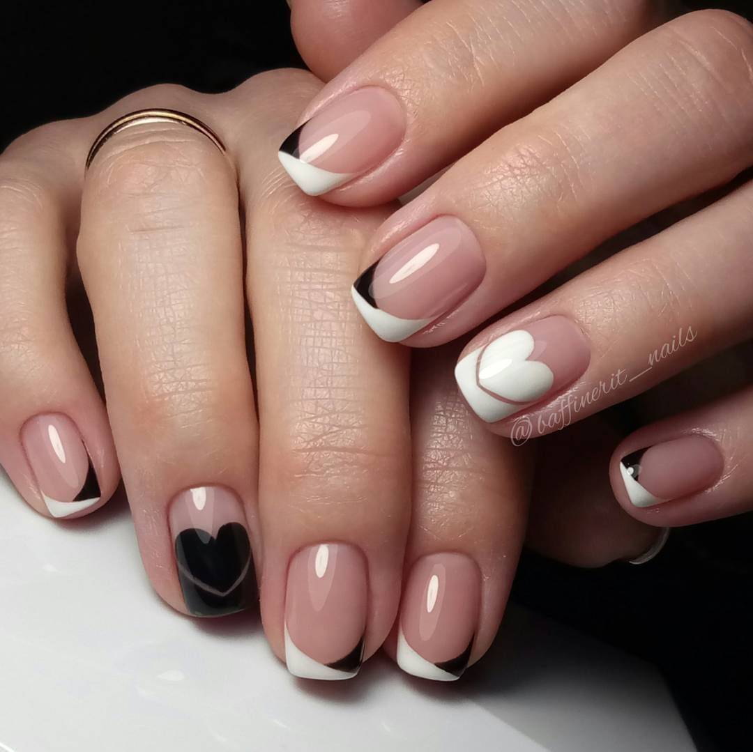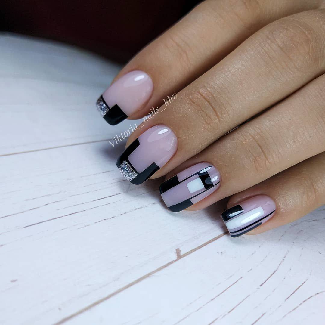 Черный и белый используются только для декора «улыбки» френча, остальное пространство ногтя покрывается прозрачным топом или светло-розовым цветом. «Улыбка» френча в черно-белом цвете отличается от классического варианта. Чтобы дизайн выглядел интересно, используйте двойную, смещенную, геометрическую форму «улыбки».