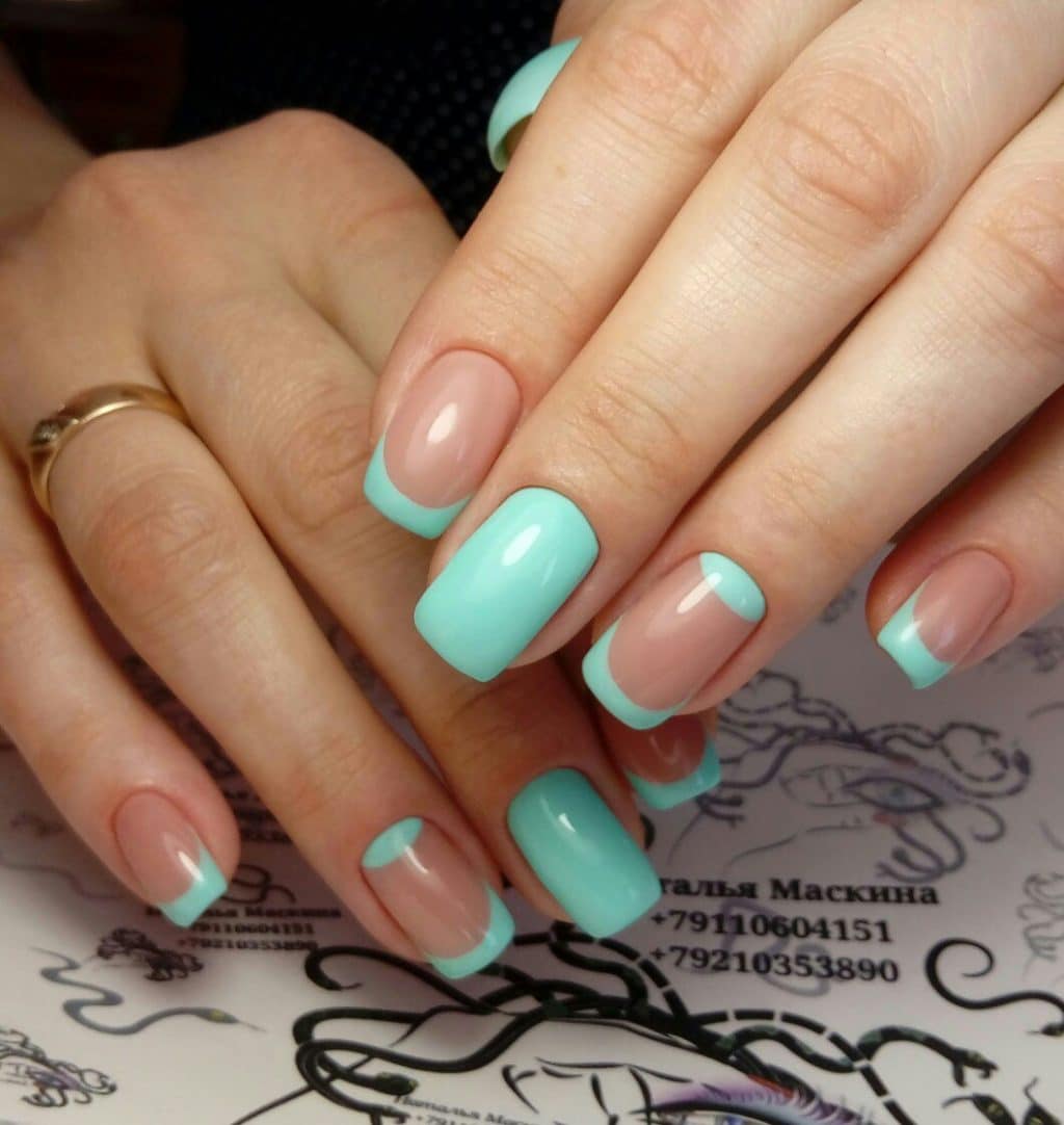 Покрытие ноготка однотонным лаком является наиболее простым вариантом дизайна, который смотрится очень лаконично и может дополнительно украшаться декором. Бирюзовый френч может быть выполнен по классическому примеру, когда цветным лаком покрывается лишь свободный край ногтевой пластины, а может наноситься на ноготок вместо прозрачной основы. Линия улыбки в таком случае остаётся белоснежной, может выделяться блестящими штрихами или несколькими камушками. Красиво и нежно смотрится подобная идея с акцентом в виде рисунков и декора на безымянном пальчике и необычная форма улыбки, например, треугольная.