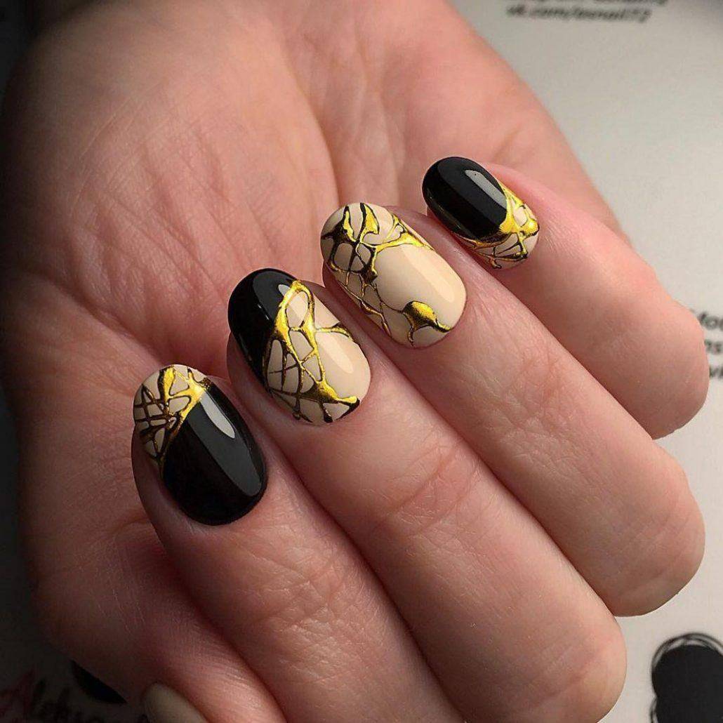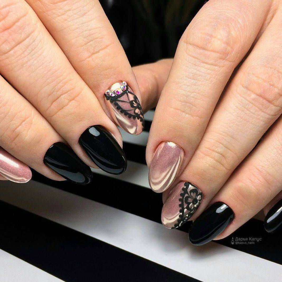 Чёрный цвет по своей натуре немного мрачен, поэтому ногти в подобном оформлении будут уместны не во всех случаях. Для коктейльной вечеринки используют разные оттенки черного, можно прибегать к графитовому или задействовать темно-серый, мокрый асфальт. На свободном крае с помощью мелкофракционного глиттера, можно сделать растяжку и темный колор станет не таким мрачным.