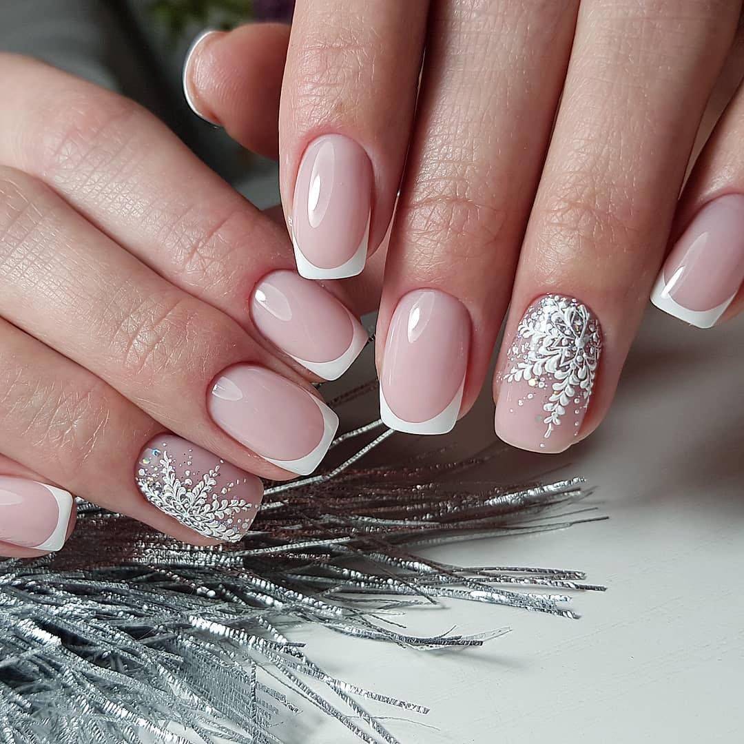 Маникюр ногтей в стиле белый френч имеет множество моделей оформления со всевозможными рисунками.