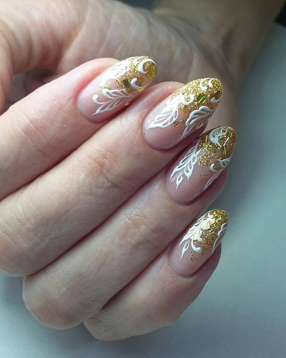 Интересный вариант украшения к торжественной церемонии использование витиеватых узоров и кружева. Руки будут смотреться нежно и элегантно, если использовать трехмерные рисунки. Весной можно добавить в композицию блестящие камушки и полоски из фольги. В летнее время нежный образ дополнят сверкающие нити и бусинки.