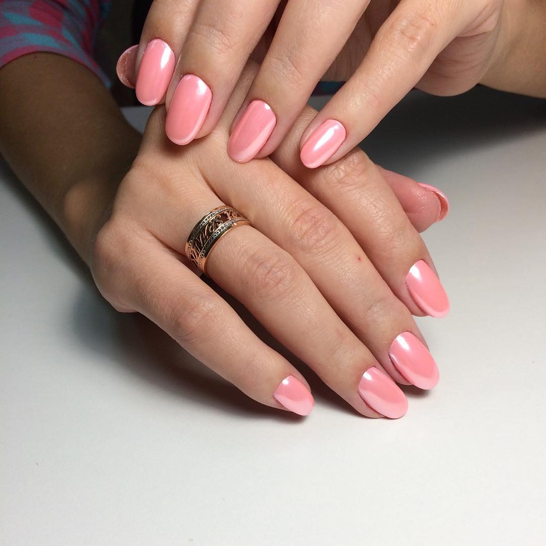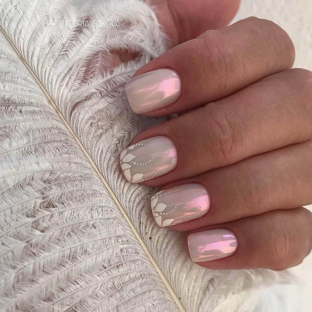 В летнем сезоне особой популярностью пользуется втирка. Зачастую она нейтрального цвета. Но на солнечных лучах ноготки преображаются на глазах и буквально сияют красивым жемчужным блеском.