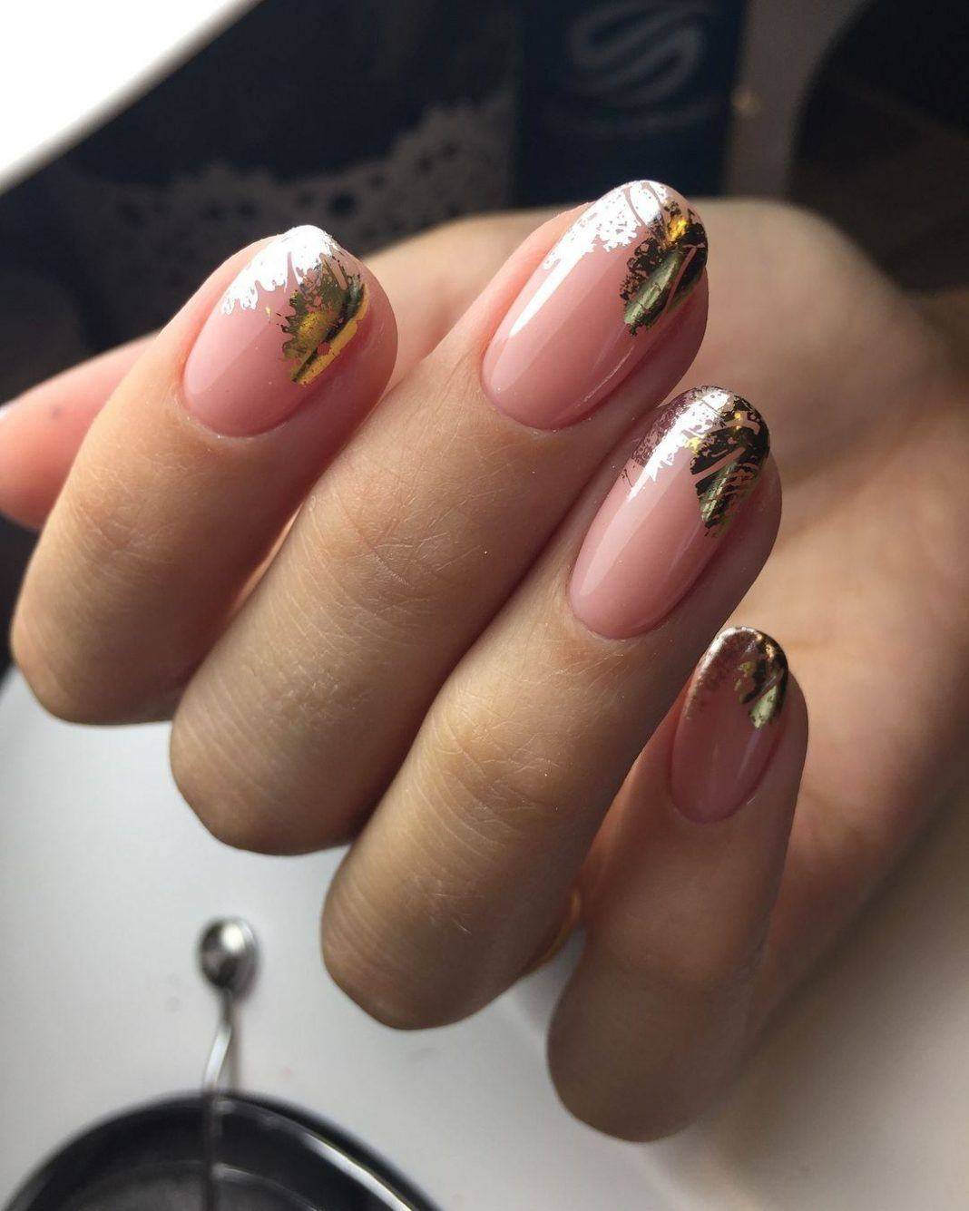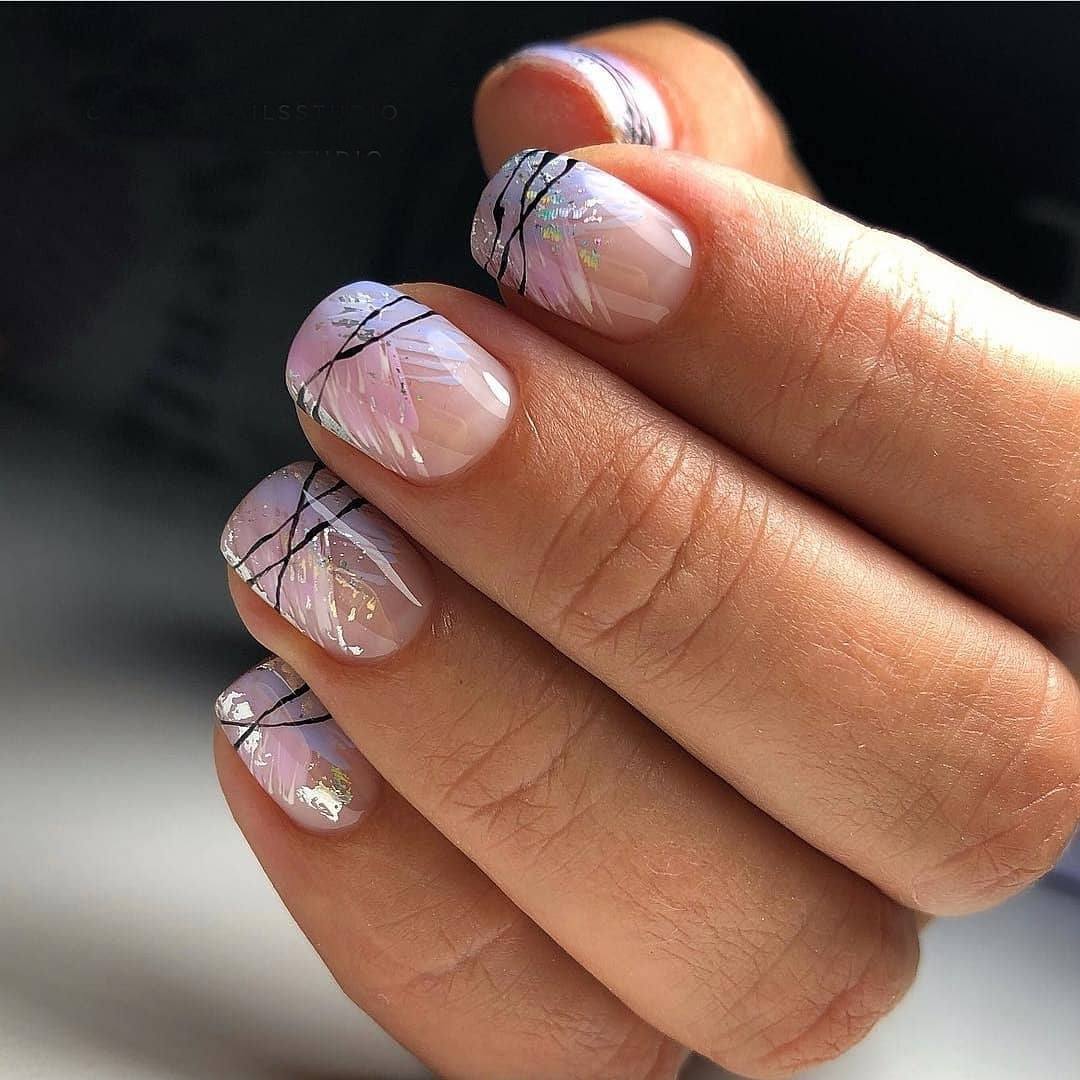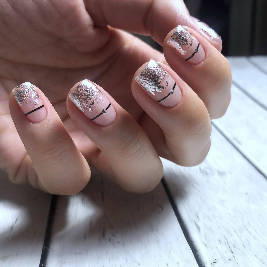 Если посмотреть на короткие ногти, представленные на фото, то можно увидеть дизайн, выполненный фольгой. Зеркальная пленка буквально растворилась на кончике пальца. Она выглядит потрясающе, словно погруженная под слои полимера. Расположение узора происходит только на одном из пальцев, образуя единую, гармоничную композицию.