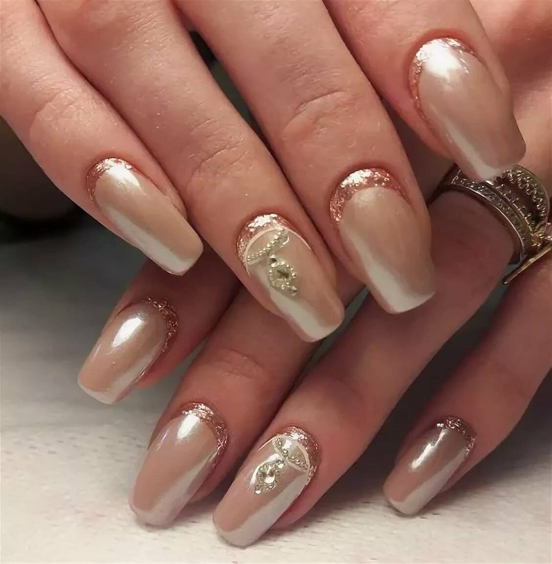 Белый френч с серебром на бежевом фоне — лучшая идея для свадебного маникюра.
