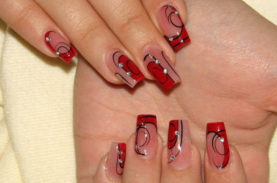 Для выполнения рисунка можно использовать различные материалы: стразы, блестки, глиттерные полоски или полимерные наклейки. Классика по-прежнему остается в моде, поэтому любительницы базового декора могут использовать для оформления красный, черный и другие оттенки.