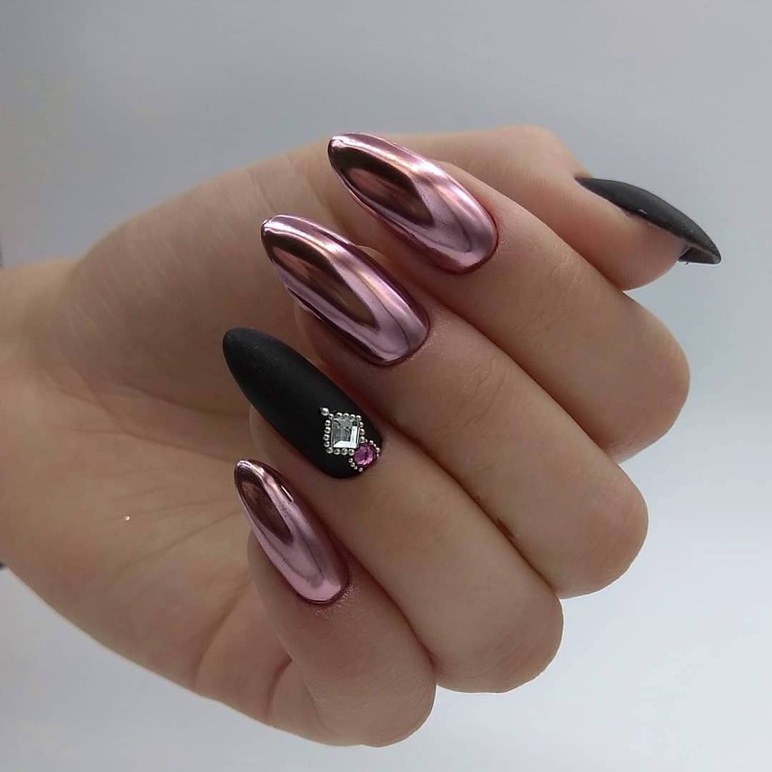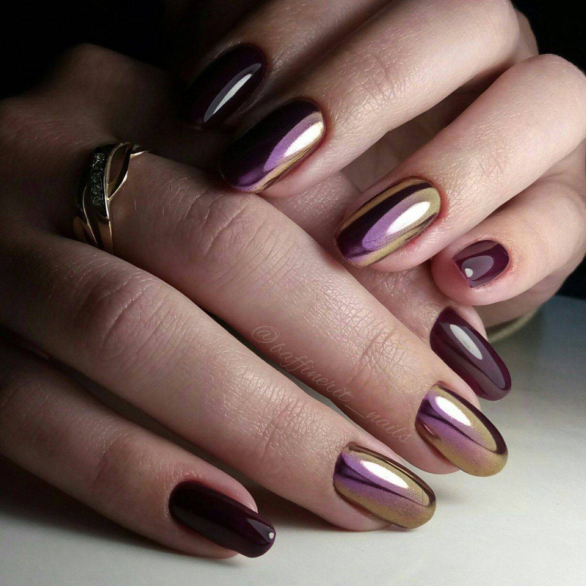 Зеркальная втирка прекрасно сочетается с черным и бордовым гель-лаком. Выделяйте втиркой безымянный палец или отдельные узоры на ногтях. Используйте помимо глянцевого гель-лака матовую текстуру. В сочетании с черным матовым фоном зеркальная втирка будет выглядеть еще выразительнее и ярче.