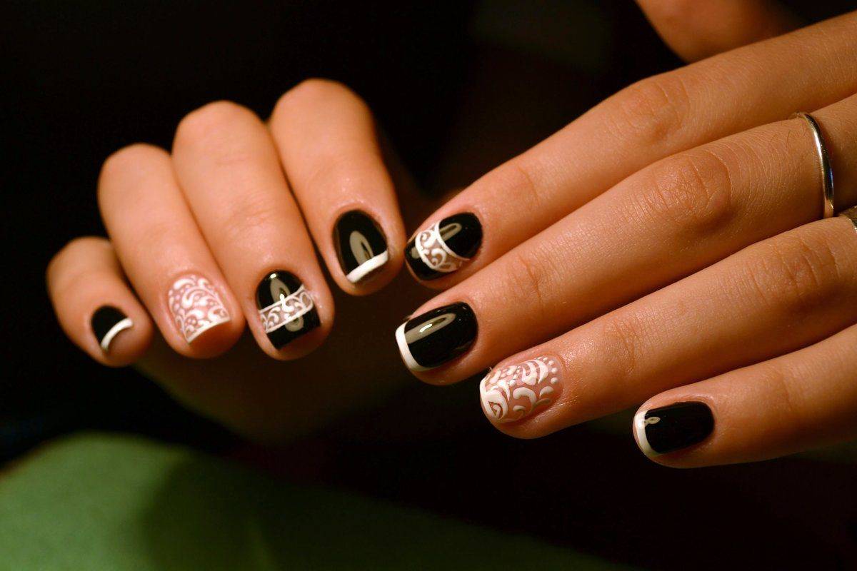 Ноготки короткой длины – это вовсе не повод, чтоб отказаться от любимого французского маникюра. На такой длине также можно выполнить черно-белый френч, который будет выглядеть ничуть не хуже. Девушкам, которые привыкли быть в самом центре внимания, предлагается нанести черную основу на всех ноготках, кроме безымянного пальчика. Для него подойдет особенный дизайн в виде кружева. Выполняем белым цветом на безымянном ноготке кружево, а на среднем лишь элегантную полоску из кружева. Еще один подходящий маникюр для коротких ноготков – это черные улыбочки в виде галочки на белоснежном фоне.