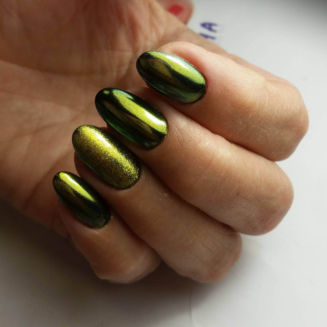 Втирка имеет свойство менять основной оттенок гель-лака. К таким к примеру относят втирку типа жук. Визуально втирка напоминает расцветку майского жука. Текстура втирки разноцветная, поэтому ее чаще всего наносят на темный фон. Перламутровая и радужная втирка отлично смотрится на светлом фоне. Френч с втиркой однозначно достоин внимания и того, чтобы вы выполнили его на своих ноготках.