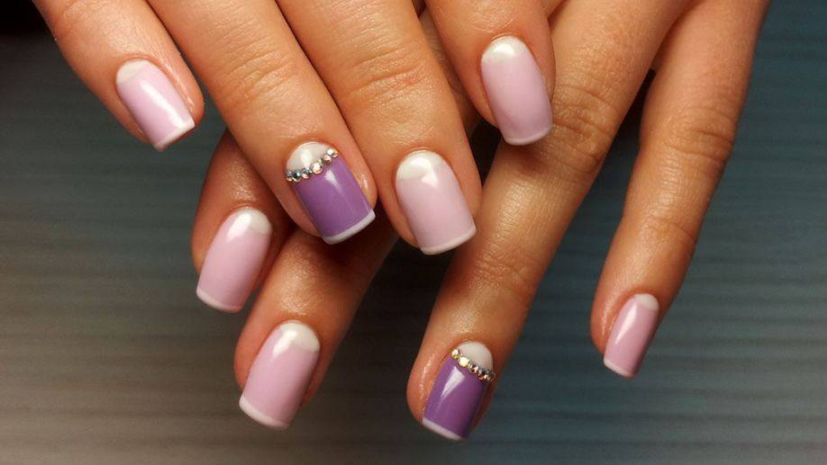 Ниже мы предлагаем еще один вариант со стразами на месте привычных лунок. Сиреневый с белым френч — особенно нежный