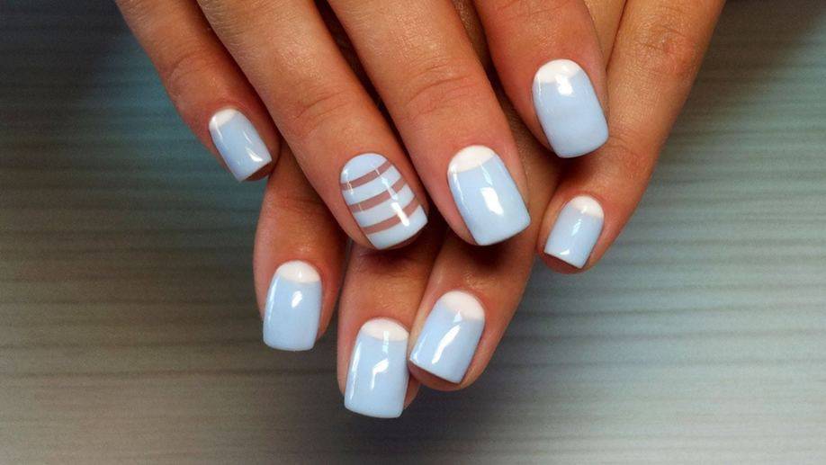 Великолепно выглядит нежно-голубой френч с блестками. Такой дизайн отлично впишется в летний образ, особенно если он дополнен узорами морской тематики. Голубой цвет также часто используется в зимних нейл-артах для имитации инея и морозной свежести.