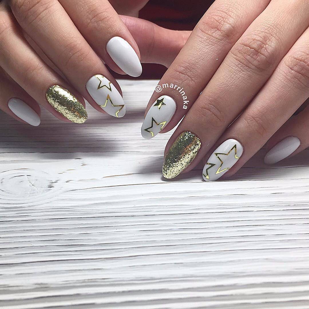 Зеркальная втирка – универсальный вариант декора ноготков. Материал можно использовать для сплошного покрытия ногтевых пластин или выделения отдельных областей дизайна. Золотая втирка отлично гармонирует с белым цветом. Это лучшее сочетание для создания повседневного нейл-арта.