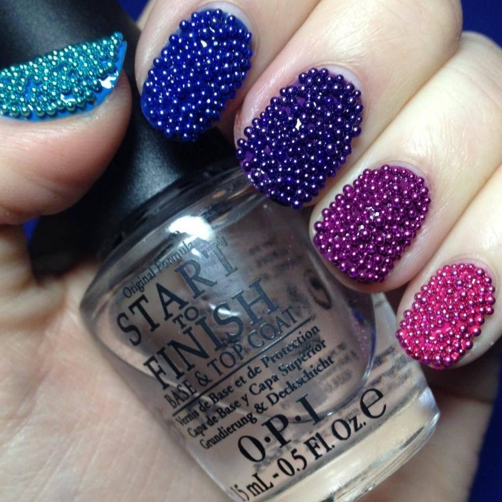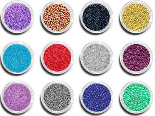 Цветовая гамма бульонок разнообразна. «Икринки» нужно наносить на лаковое покрытие, пока оно не просохло. Можно для крепления использовать и клей. Если полностью покрывать бульонками ноготь, то можно просто окунуть его в баночку с бусинками или высыпать их на салфетку. В случае, если бусинки будут использоваться для нанесения узора, лучше воспользоваться зубочисткой, палочкой или специальным дотсом.
