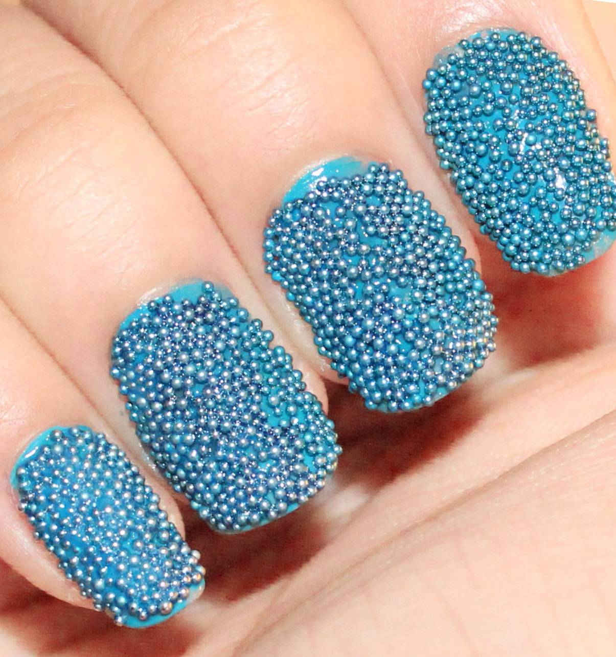 Для того чтобы «икринки» не потеряли свой цвет, после выкладки их на гель-лак не рекомендуют наносить топовое покрытие. Нужно просто просушить ногти в лампе.