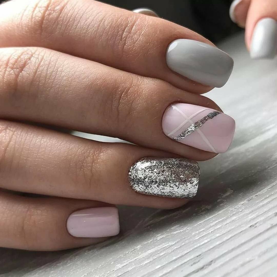 В тренде сочетание блестящего декора и геометрии. Стильно смотрятся полоски посередине ногтя, выполненные серебром. Для весеннего и летнего нейл-арта выбирайте флористику с веточками и листочками, выделенными глиттером. Используйте в молочном маникюре как глиттер, так и стразы, но в умеренных количествах. Такой дизайн отлично впишется в деловые и повседневные образы.