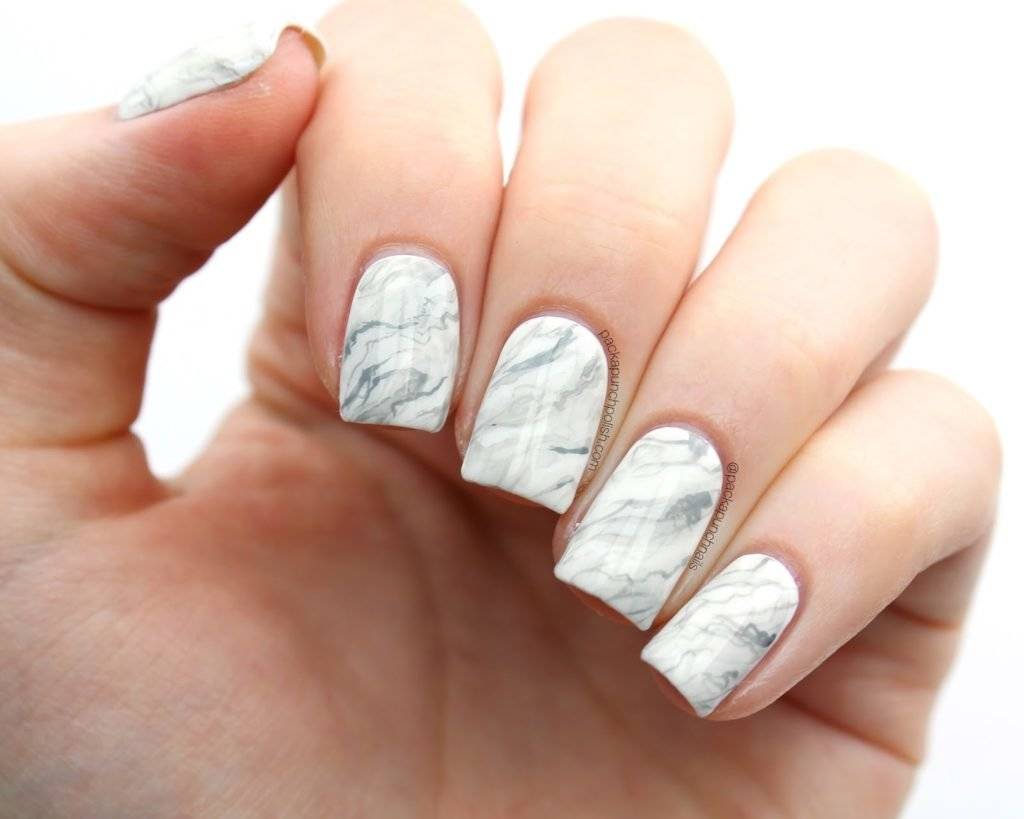 • Белый «мрамор» на всех пальцах. Классический вариант. Подходит для деловых женщин. Такой дизайн одинаково хорош как на коротких, так и на длинных ногтях.