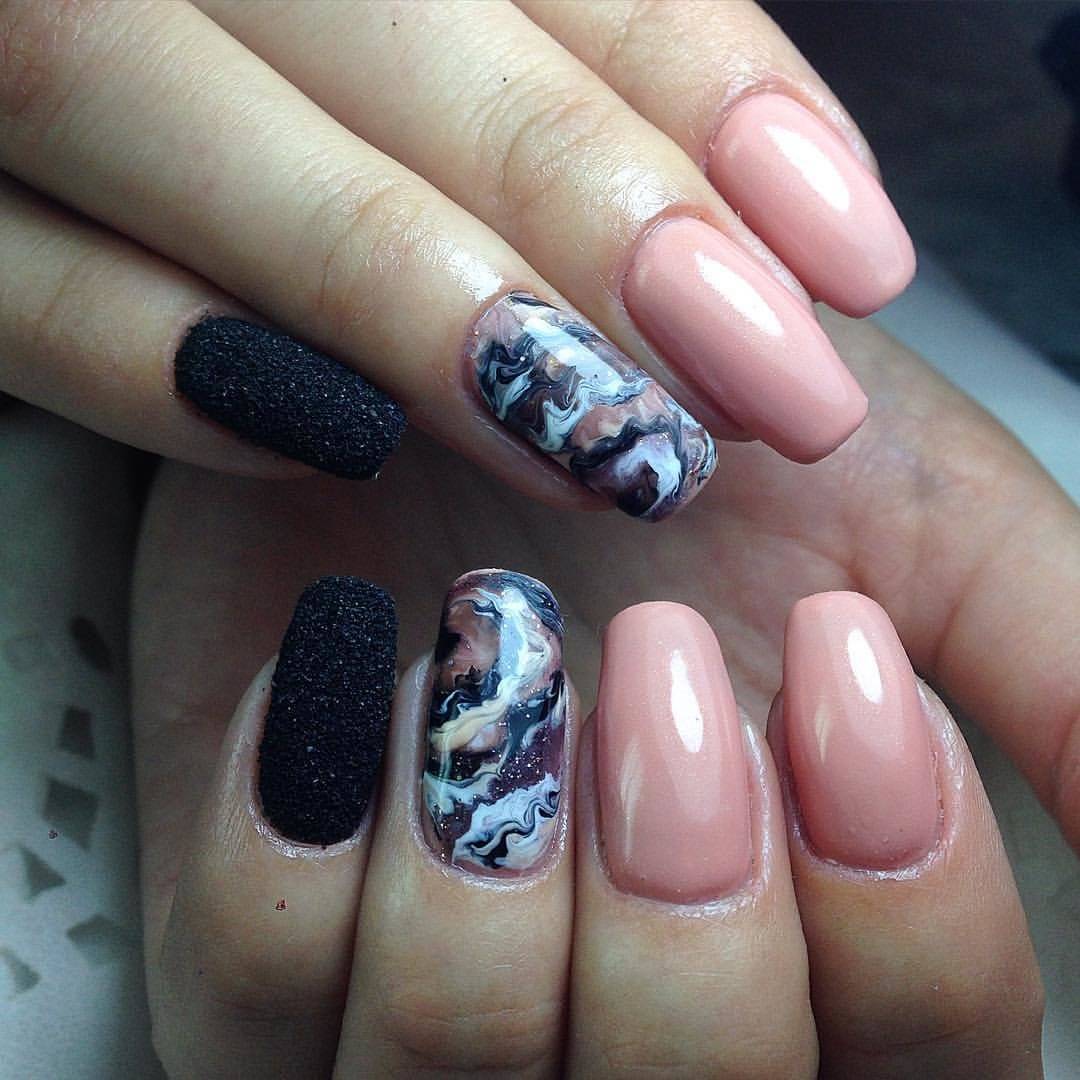 Нежный девичий маникюр пастельными оттенками. Основное преимущество классического мраморного дизайна – его универсальность. Сочетать черно-белый рисунок можно с любыми цветами.