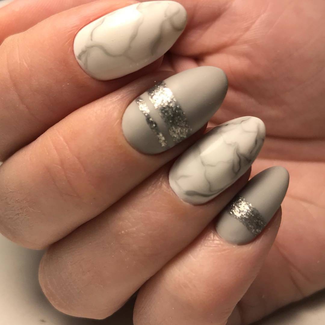 Идея оформления с блестками. Посмотри, как тонко выполнен мраморный узор – такой вариант уместен для любого случая, в том числе и для повседневной носки.