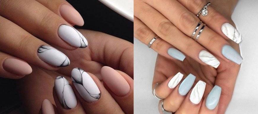 Мрамор эффектно смотрится с матовым финишем. Не рекомендуется перекрывать матом сам узор, а вот «соседние» ногти в матовом цвете отлично дополняют оформление.